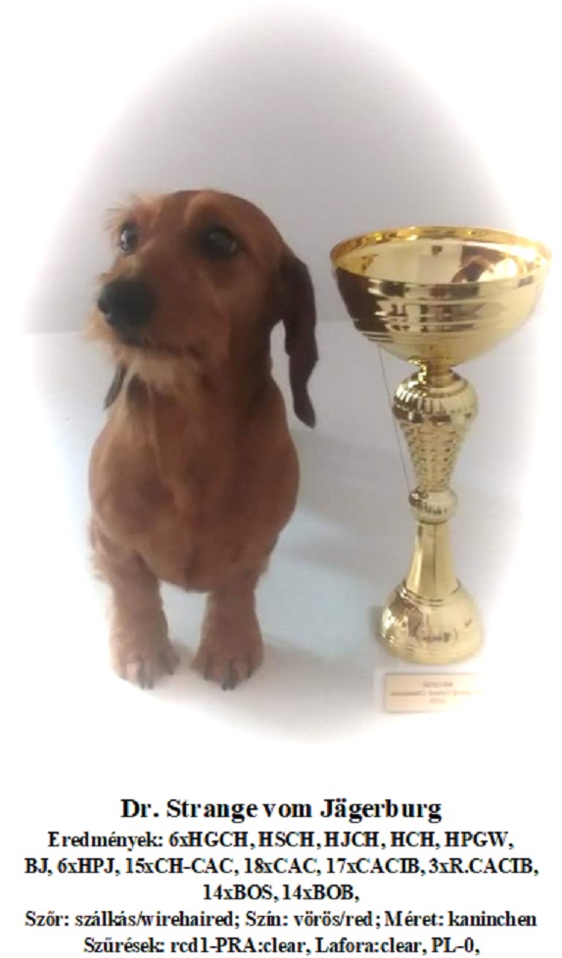 Rüde:HJCH HCH, 5x HGCH, 2x HSCH, SRBCH TSZ, 13xBOB 11BOS 17xCACIB 3xR.CACIB, 26x CAC, R.CAC. BJ 6x HPJ HPGW Dr.Strange vom Jägerburg MET.Szt 2218/20 ![]() rauhhaar rot PL-0