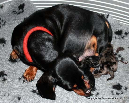 Einige Richterberichte: Richterbericht.....Frau Altenmeier 2,5 Jahre alter schwarztiger Rüde,mit guter Zeichnung, gut abgesetzter Brand,typvoller Rüdenkopf sehr gute Hals-Rückenpartie, gut gewinkelt und geführter HH, hervorragende VH Freundliches Wesen.....9,3 Kg ....45cm Brust